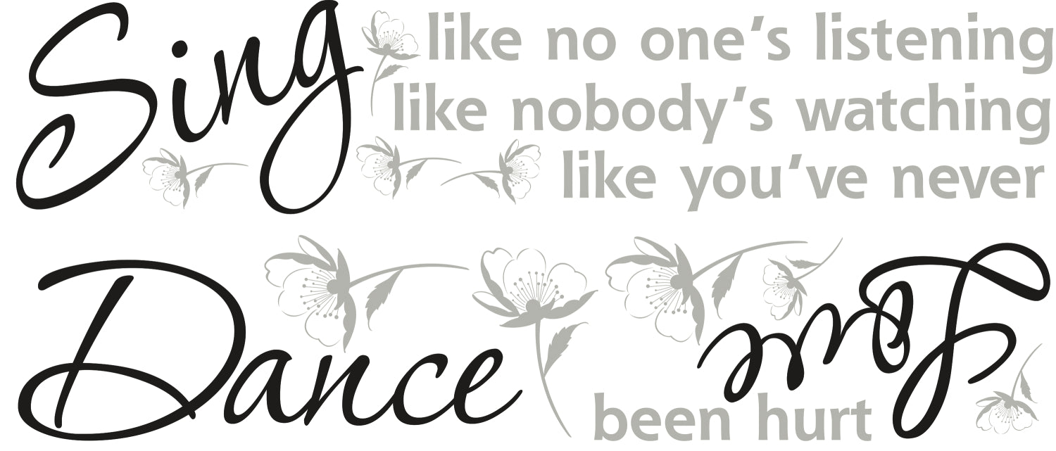 Sing like no one's listening, dance like nobody's watching, and love like you've never been hurt--these are words to live by. Add these beautiful phrases to any wall with this elegant set of stickers. Since each word and accent is individually cut, you can place each piece on walls, furniture, stairs, or any other smooth surface. You can even use the added decorative accents to spruce up other pieces or places in your home!