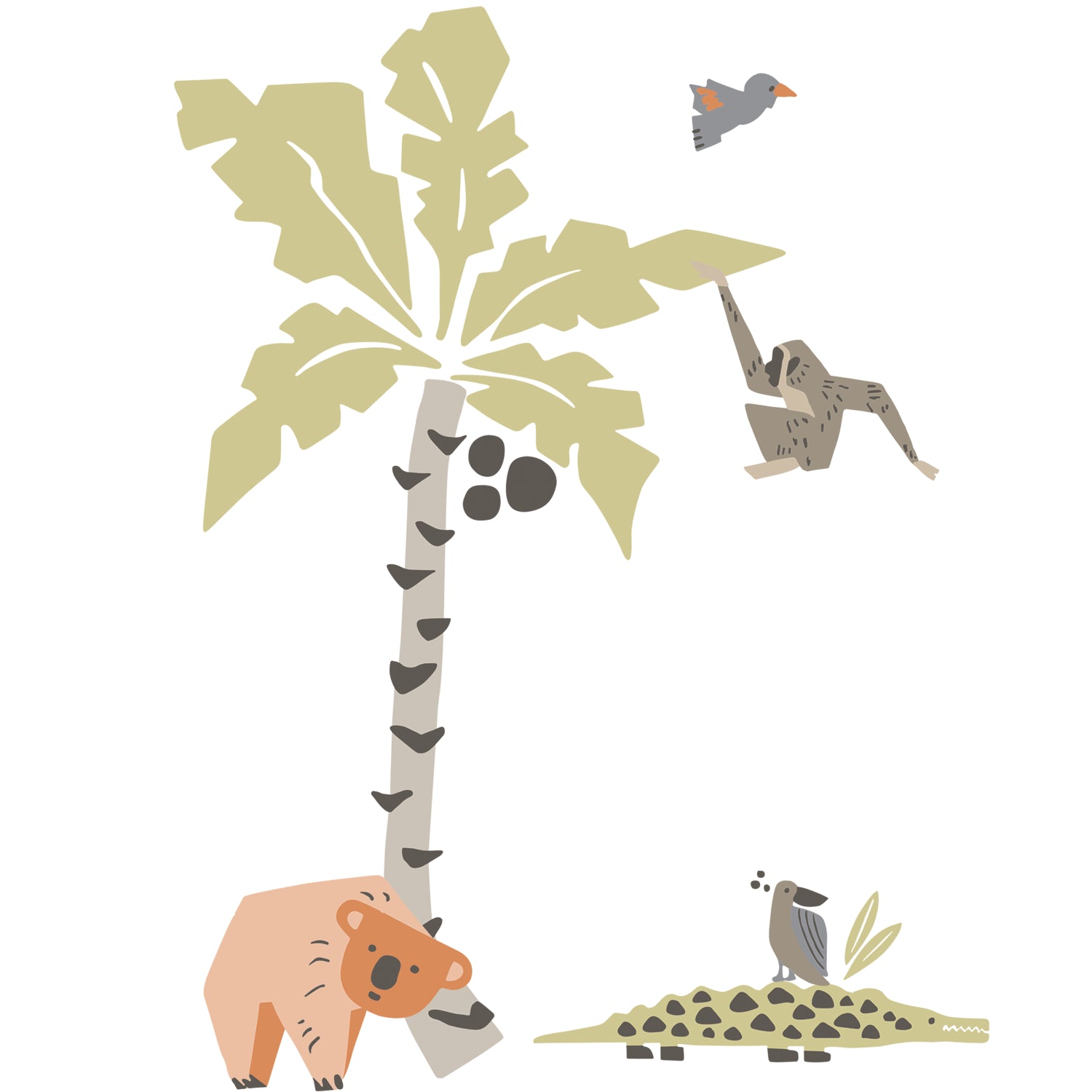 Convert any room into a real life safari with DwellStudio Jungle Palm Tree Giant Wall Decals by RoomMates Décor. A colorful wildlife scene takes over the moment you hang these officially licensed DwellStudio wall decals in a room. This wall decal set includes fifteen wall decals featuring one furry bear, one alligator, a swinging monkey and more wildlife animals dwelling amongst a pale blue palm tree. The perfect décor for a nursery or kid's room, hang these charming wall stickers on walls, furniture and more. Get the look in minutes with a simple two-step process – Just peel and stick! Wall decals are created with a high quality vinyl that allow you to remove, reposition and reuse them over and over again while keeping walls completely safe. Bring a safari scene to your room This product is printed on a clear material. White or light colored walls are recommended for best results.